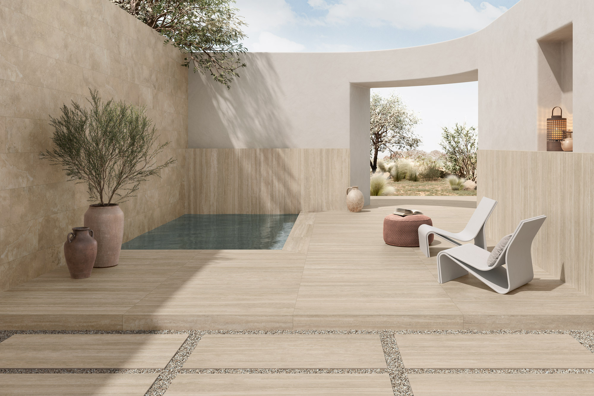 Iconica reinvents the charm of travertine in a complete system of surfaces, which multiply the aesthetic and design perspectives. From a calibrated graphic and chromatic reinterpretation, a versatile and cosmopolitan design tool is born, which combines timeless aesthetics with the exceptional performance and functionality of porcelain stoneware.