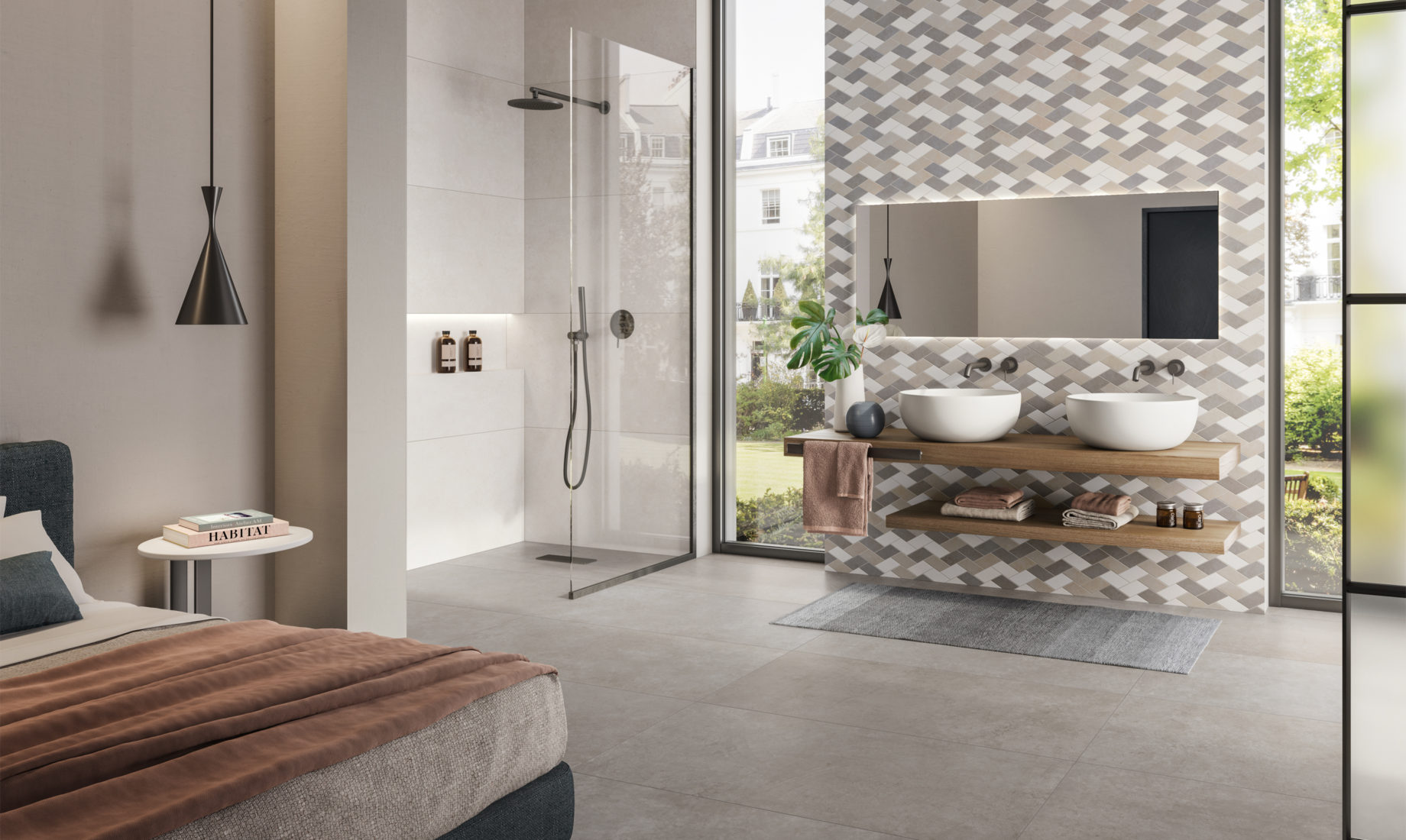 Esprit porcelain stoneware surfaces dress contemporary interiors with a new interpretation of industrial aesthetics.