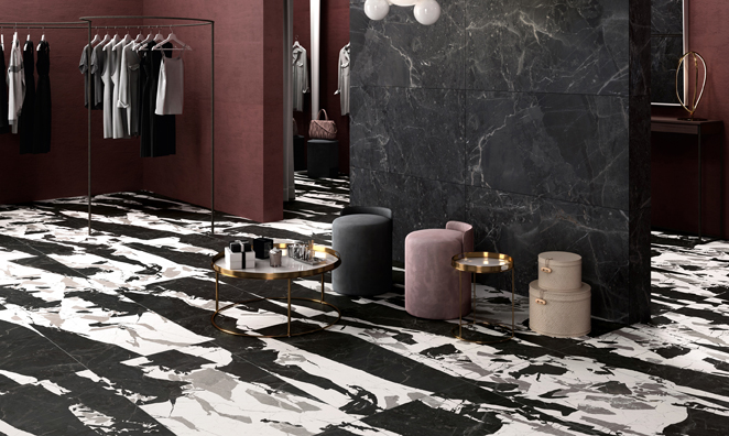 Arcadia represents porcelain stoneware that emulates the appearance of marble in a new contemporary perspective. It is based on a careful selection of precious and evocative varieties, characterized by directional veining and intense color contrasts.