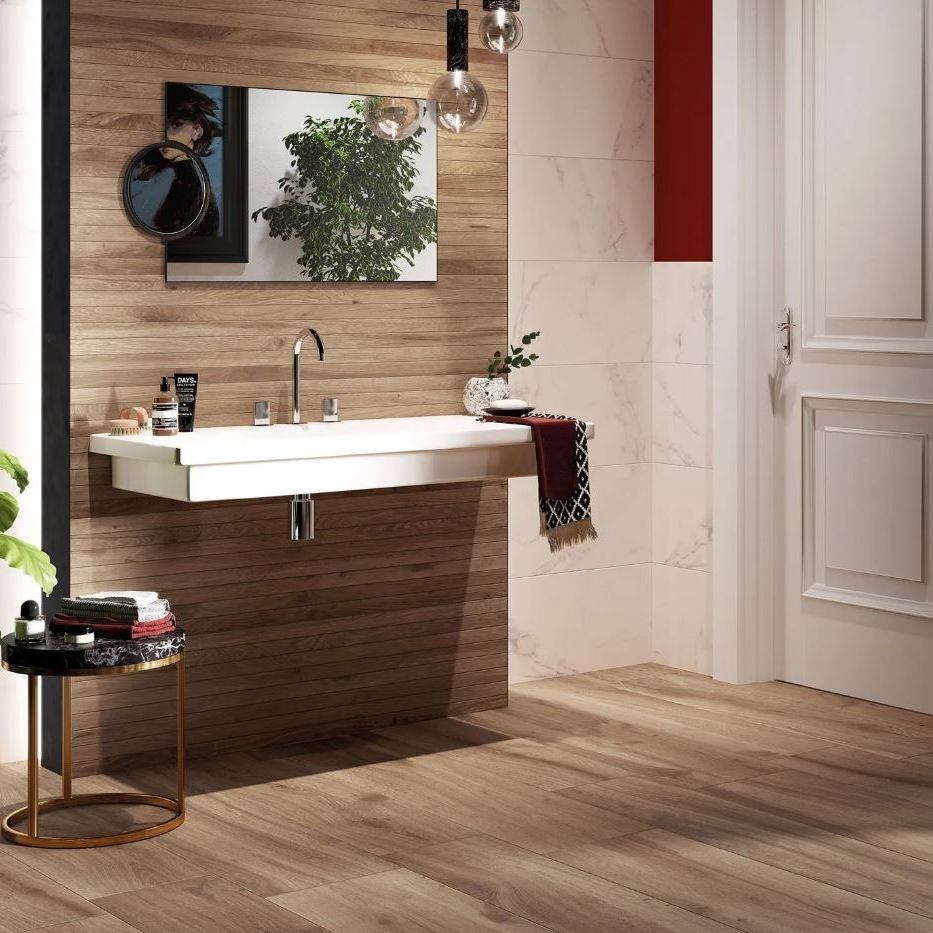 The faux wood tiles from Ceramica Rondine's new collection draw inspiration from the dreamlike and captivating beauty of the Venetian lagoon, a place with a thousand-year history that has always witnessed a symbiotic bond between man and water. And it is precisely in the lagoon landscape, rooted in its seabed, that we find one of Venice's iconic elements: the bricola, a nautical structure that marks the navigable zones in the canals, providing important information. The symbolic power of this wood, its distinctive, time-worn appearance, rich in detail, encapsulates the history of the lagoon, translating it into porcelain stoneware wall and floor tiles.