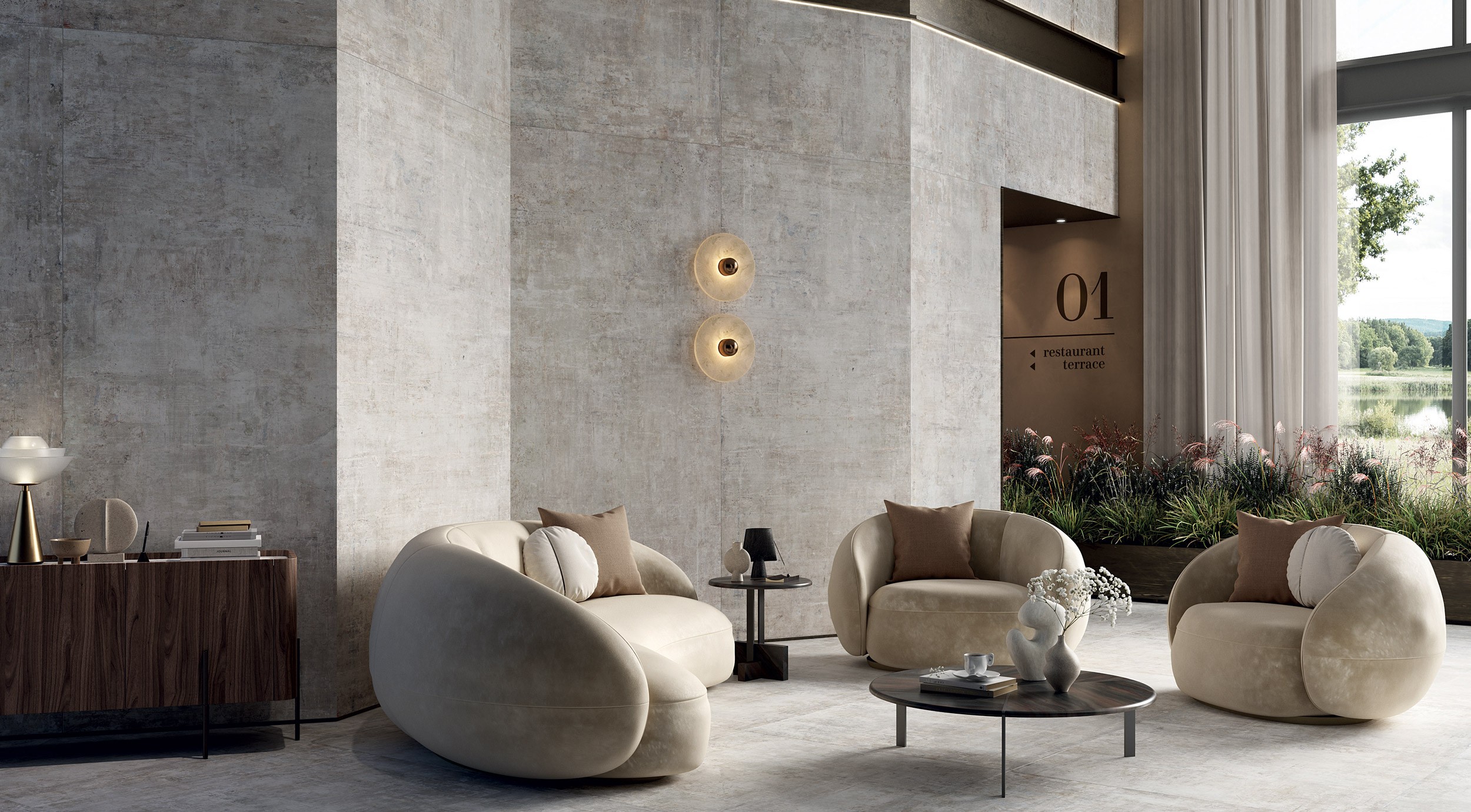 Imperfection is the hallmark of this collection, which, by reproducing a lived-in look, stops time and offers contemporary floor and wall coverings for unique and unmistakable spaces. Murales concrete-effect porcelain stoneware tiles convey emotion and bring living spaces to life.