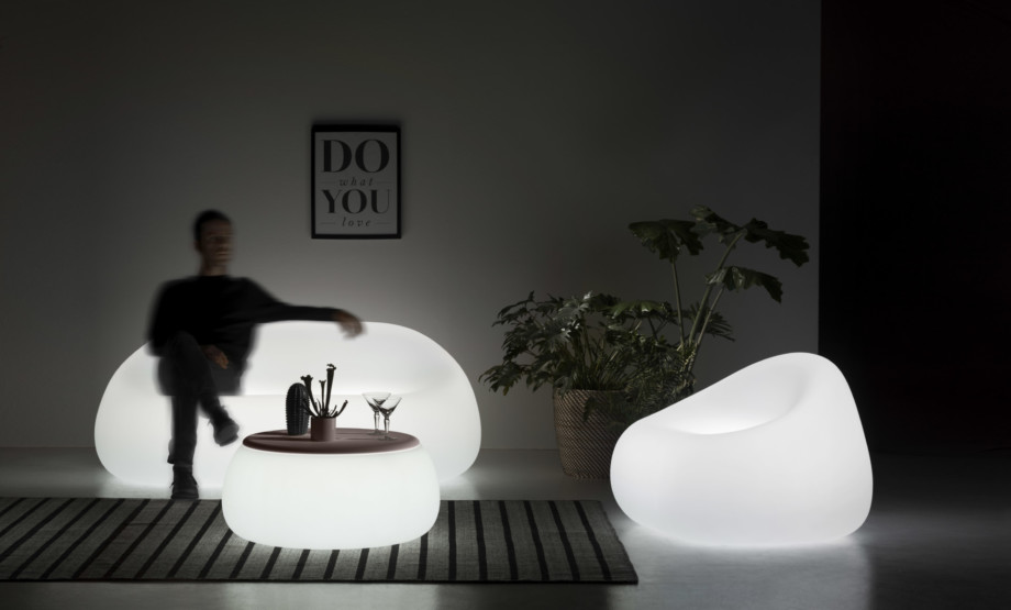 Armchair with an ergonomic and enveloping shape, particularly suitable for recreational contexts, it is also available in a luminous version._x000D_
