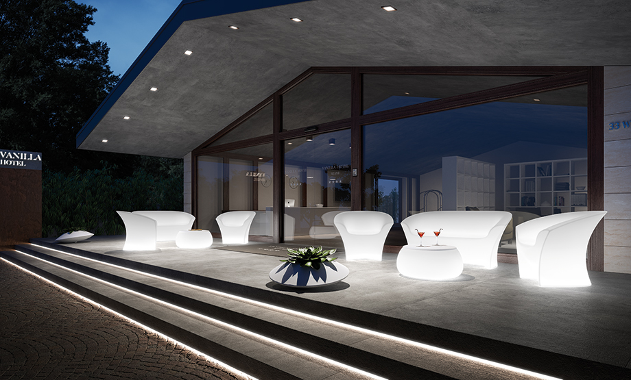 Equipped with 2 light kits, it furnishes indoor and outdoor spaces with a strong personality.